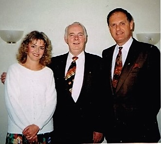 Then an interesting event changed my thinking. A friend and salesman at my father’s tailoring firm, Bill Hanlon, said he was moving back to Sidney, Cape Breton, because his wife was terminally ill and wanted to be with her family. I suggested that he train selling CFIB memberships in Ontario and if he could do it we would employ him as our first District Manager in Atlantic Canada. And that is what he agreed to do. I said I would come down to Sydney to help him get started just as I was doing with new hires in Manitoba and Saskatchewan at the time. In the photo taken 15 years later, Bill can be seen with me and our new Director of Research, Catherine Swift.