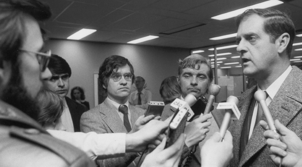 I publicly referred to Allan MacEachen as "Alice in Blunderland" and launched a media blitz. In the photo, I am sounding off at a news conference about a budget process controlled by faceless bureaucrats.