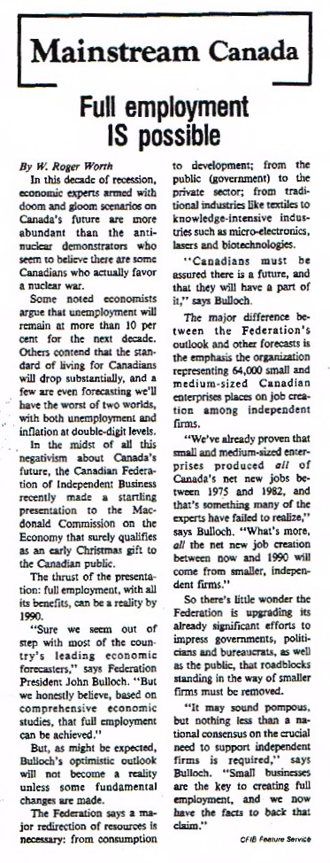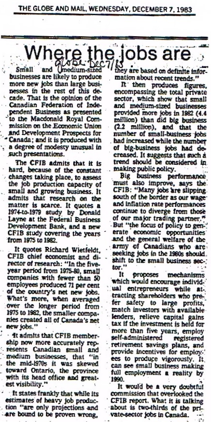 I don't think I have ever been prouder of CFIB than when we submitted it in on December 1, 1983. Our suggestions for the creation of full employment was based on our own research that showed that between 1975 and 1980, small firms with less than 50 employees produced 71% of the country's new jobs, but when taking the period 1975 to1982, firms with less than 50 employees created all the new jobs.