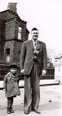 In the photo, Dad is seen in front of his parent's home on Maryville Park holding onto Robert. Love the two cameras he always had with him, one for colour and one for black and white.