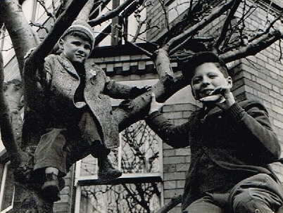 The garden, like so many during the war, was devoted to the growth of vegetables and had a greenhouse where they sprouted from seeds. And the mature fruit trees gave them a year's supply of apples. Ian and Robert in the photo are in one of the fruit trees. Ian is eating what is called a "slider", which is ice-cream between two wafers.