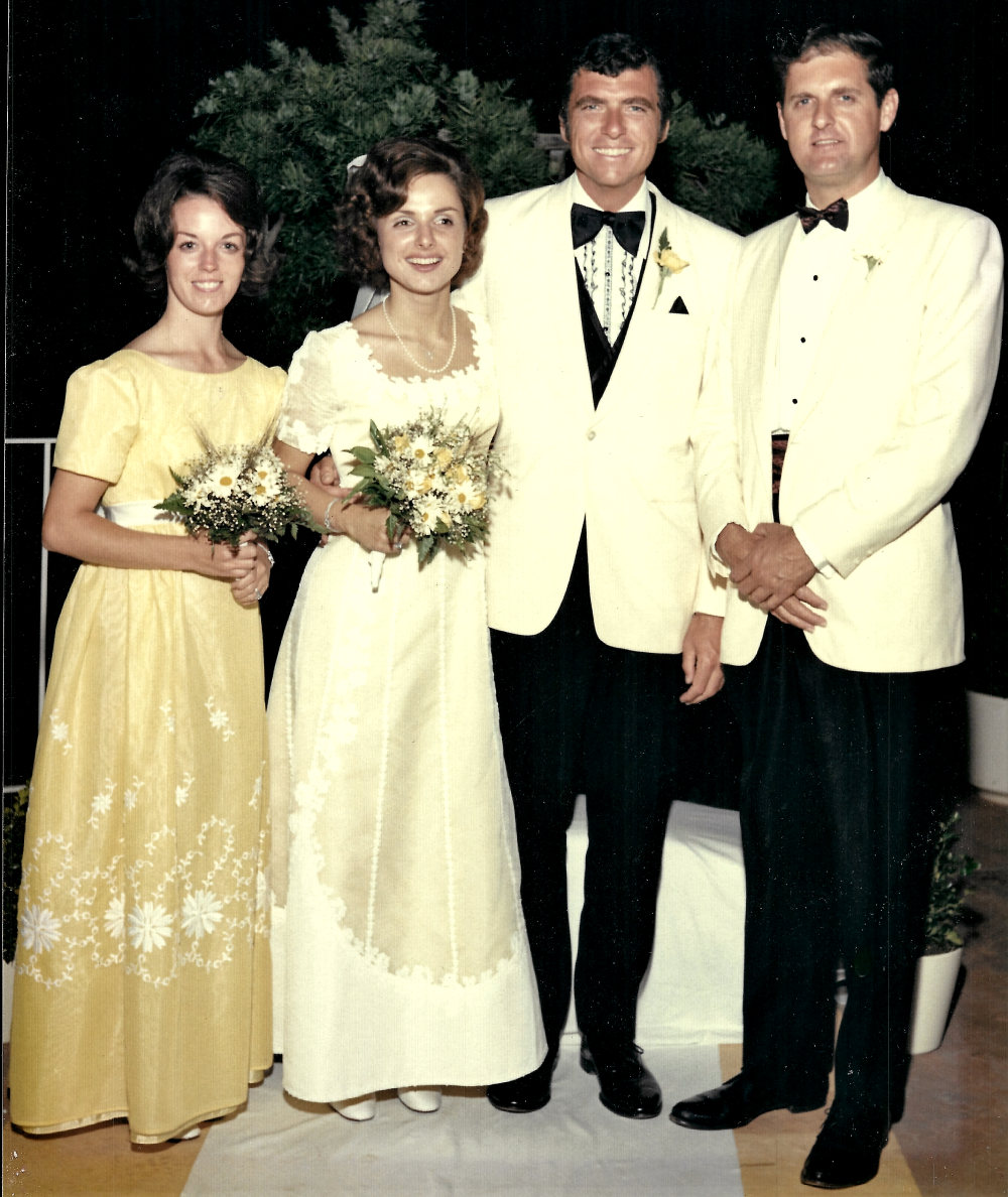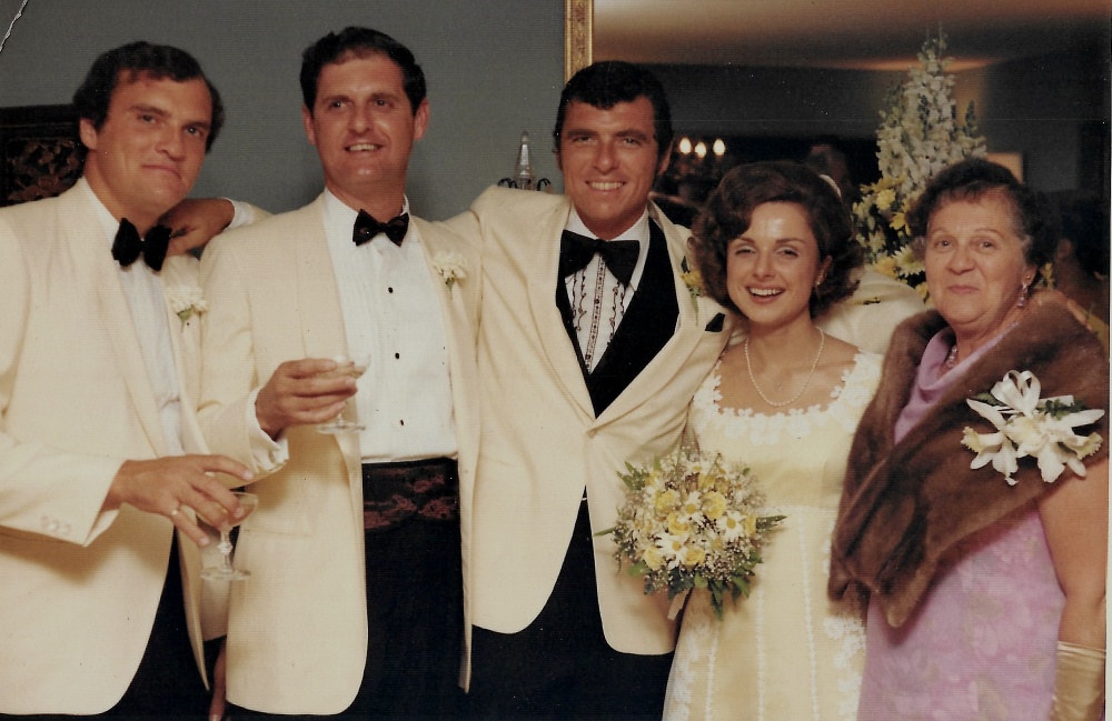 During our other weddings, someone was always missing. Dad caught Ian smoking on our wedding day in 1955. They had a big fight, and Ian took the train home from London. Ian did not attend Robert and Jane’s wedding, and none of the brothers attended Peter and Barbara’s wedding in England. Love all of us in white jackets in the group shot of the brothers with Dad. My jacket did not fit, I remember (even when I sucked in my tummy).