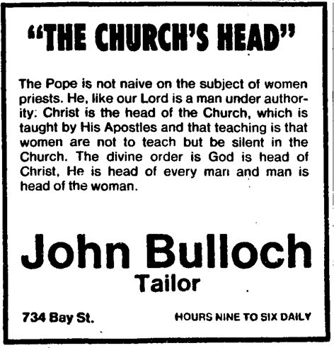 Of course, by the 1970s, I was running the CFIB and could not in any way try to influence what he was trying to say in his ads. Although I admired my father and his courage, philosophically we were different people. He was a social conservative, and I was a social liberal. He was an economic liberal, and I was a moderate economic conservative. The ad about men being the boss of women was typical ‘evangelical nonsense’ from my perspective.