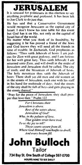 I got a huge bang out of Dad's ad promoting Joe Clarke's campaign promise to move the Canadian embassy to Jerusalem, the capital of Israel. Every politician going after the Jewish vote plays the same card. I have been to Jerusalem and talked to government officials who said that whether countries move their embassies from Tel Aviv to Jerusalem is not a big deal. It sounds good on the campaign trail. But when they get elected and have to govern, they do not want to face all the hostility from Palestinians and Arabs.