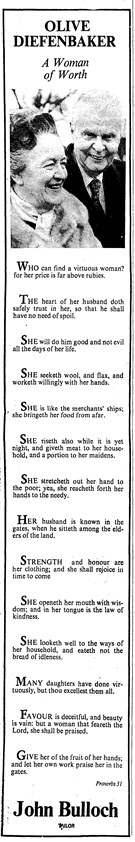 Father's tribute to John Diefenbaker and his wife Olive was a product of genuine mutual respect. Former PM Diefenbaker was one of the few politicians in Ottawa who knew that Dad and I were two different people. Mr. Diefenbaker was on my old TV show, Bullseye Ottawa in 1972, so he knew me personally.