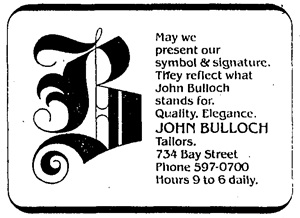 But did that ad ever stir things up! His store was blockaded by feminists, who just gave him more publicity for free. He had TV cameras taking shots of the women parading in front of the store. The customers loved the excitement. Getting a Bulloch tailored suit was really an experience.