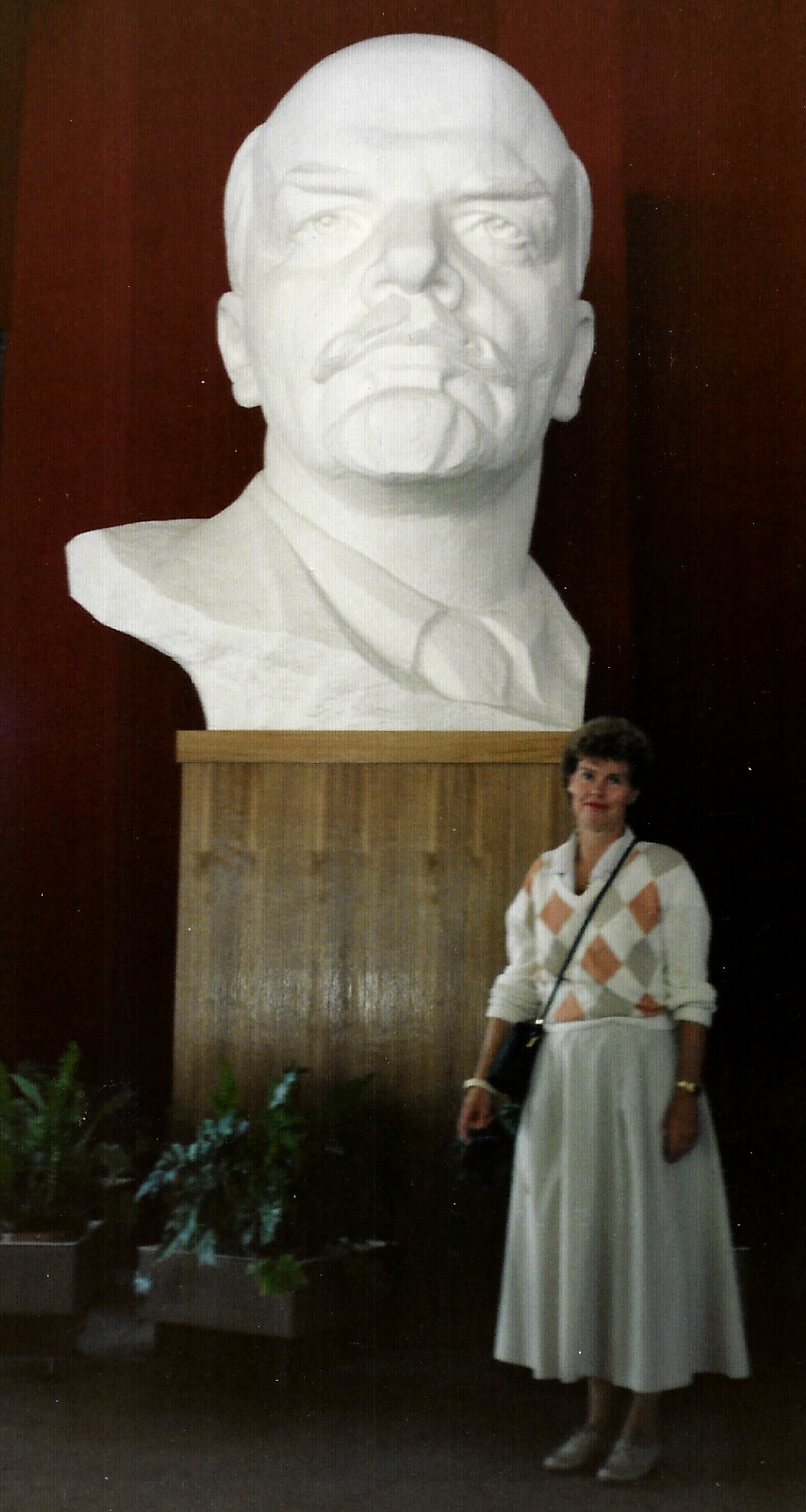 We wandered about Moscow in advance of the tour. The place seemed to be in decay. The grass in the parks had not been cut. Pieces of concrete were falling off buildings. People took off their windshield wipers when they left their cars because of widespread theft. There were no cars with hubcaps. We wandered into the large GUM department store. There was nothing available that we would have kept even if it was given to us. And lots of Lenin statues. Mary is photographed in front of one of them.