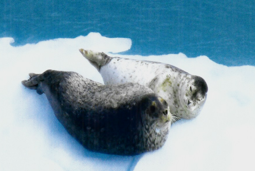 Heading down the passageway to the Tracy Arm Fjord, we have a great photo of a mother seal and her pup. In the cabin next to us, a five-year-old said to his grandpa, "Holy moly grandpa." I loved it because it was obviously his grandpa's expression from the 1940s.