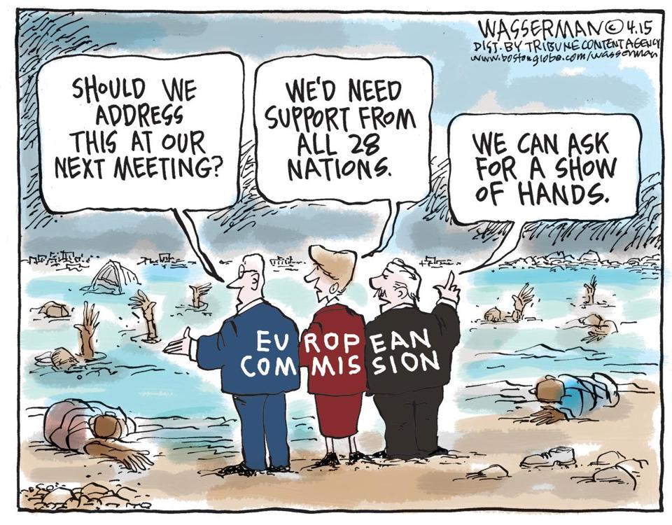 So, I can understand some of the tensions and anti-immigrant sentiment that is becoming one of the real threats to the unity of Europe. The cartoon shows the European bureaucracy unable to really cope with the wave of immigrants washing up on its shores.