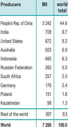 Something like 70 nations of the world have coal reserves that are being exploited in some manner. The graph shows the major producers.