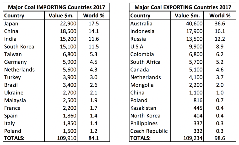 The graph shows the big exporters and importers of coal, and for Australia it is a $40 billion business. And until those large importers of coal, like Japan, India, China and South Korea, find alternative energy sources, Australia will continue to be a coal giant. And those cheaper alternatives will not be natural gas that is available in the US and Canada. It will be wind and solar.