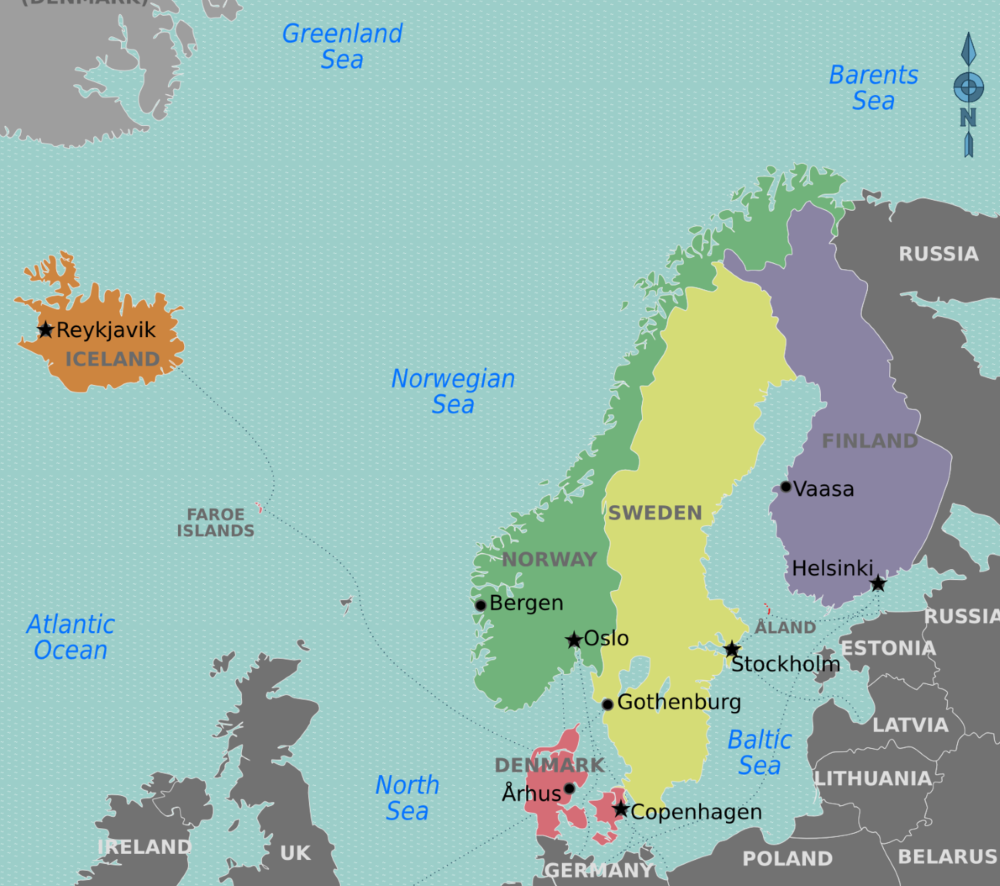 The map shows the Nordic countries of Iceland, Norway, Sweden, Denmark and Finland. What they obviously have in common is the Arctic climate, with long summer nights and cold dark winter days.
