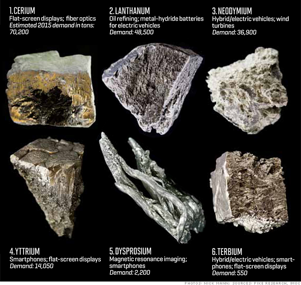 Our photograph provides background information on six of the more common REEs. The important information is the market these scarce materials serve. Like the magnets needed to generate electricity in wind turbines. And the batteries needed to operate electric vehicles.