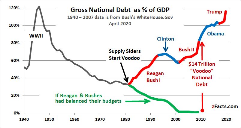 This diagram shows the explosion in the US national debt which is in the order of $ 26 trillion. Ever since the days of President Reagan, US governments have been cutting taxes while promoting the concept that tax cuts are a way to increase revenues. Voodoo economics.