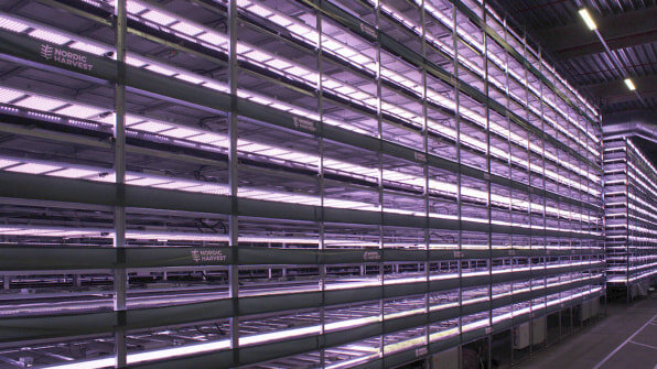 Vertical farming is another form of hydroponics, and the big challenge is the cost of powering the LED lights which replace sunlight. This photo of 14 levels of hydroponics outside Copenhagen is powered by wind. Of course. Windy Denmark.